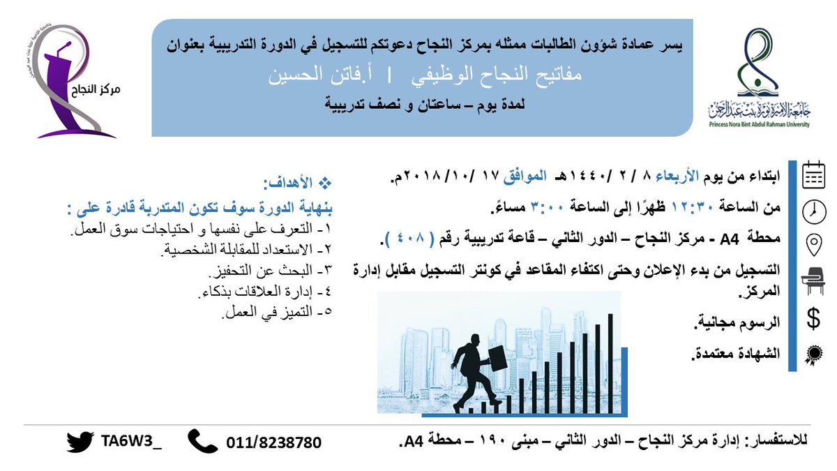 جامعة الأميرة نورة A Twitter إعلان من عمادة شؤون الطالبات ممثلة بمركز النجاح للتسجيل في الدورة التدريبية مفاتيح النجاح الوظيفي جامعة الأميرة نورة Pnu Https T Co Gnlfict5kj