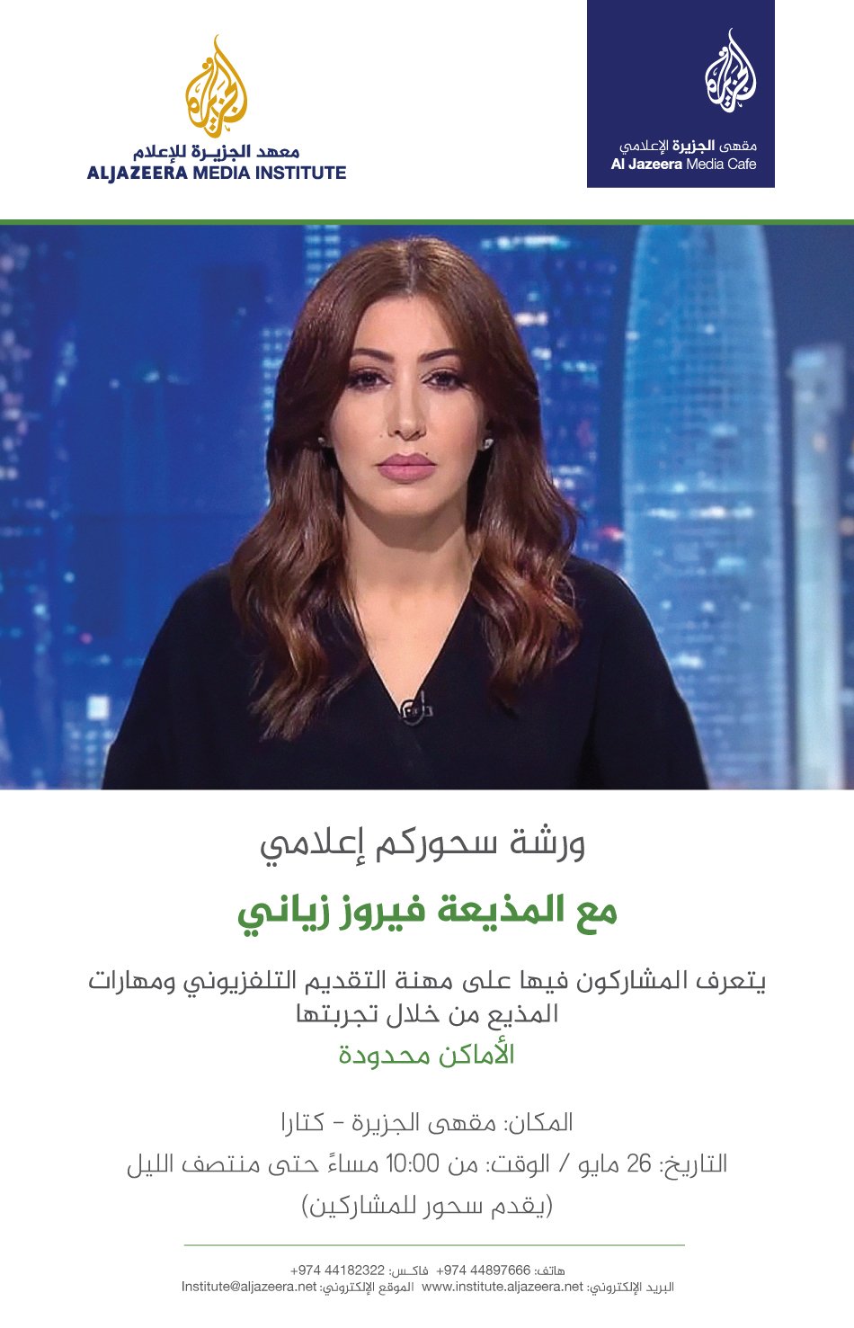 معهد الجزيرة للإعلام A Twitter سحوركم إعلامي شارك في ورشة التقديم التلفزيوني مع الإعلامية فيروز زياني 26 مايو في مقهى الجزيرة الإعلامي بكتارا من 10 مساء حتى 12 منتصف الليل للتسجيل من هنا