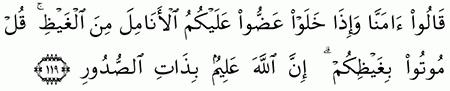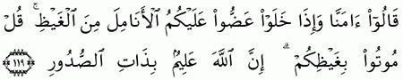 من الآية 119. قل موتوا بغيظكم إن الله عليم بذات الصدور إن قيل. خ ل و ا ع ض وا ع ل ي ك م ال أ ن ام ل م ن ال غ ي ظ ق ل م وت وا ب غ ي ظ ك م إ ن الل ه ع ل يم ب ذ ات.