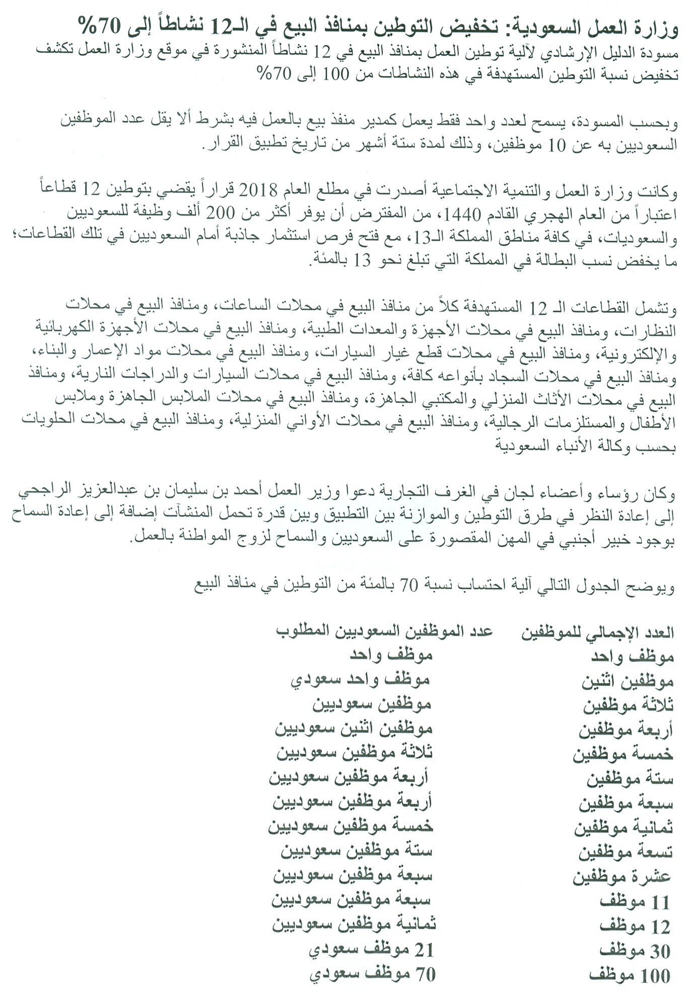 العمل تدرس تخفيض نسب التوطين بمنافذ البيع في 12 نشاطا من 100 الى 70