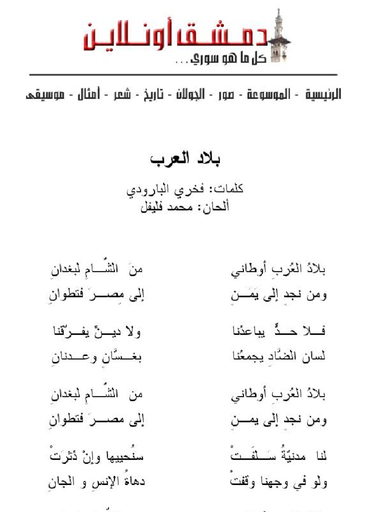كلمات بلاد الع رب أوطاني الفنان. بلاد العرب أوطاني هو نشيد عربي يتغنى بالوطني ة القومية العربي ة ويمتدح الوحدة. ولا أحد ه نا ي شد و.