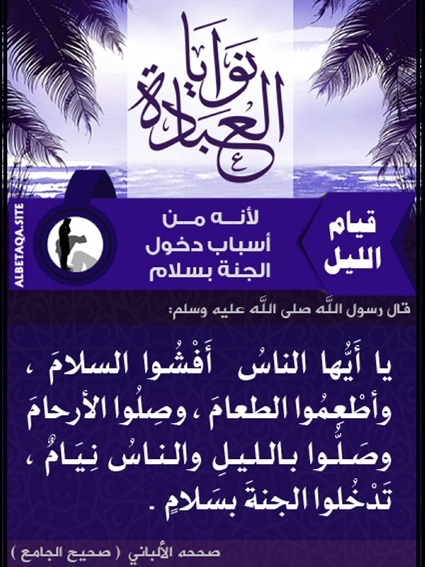 أ ي ه ا الن اس أ ف شوا الس لام و أ ط ع م وا الط ع ام و ص ل وا بالل ي ل و الن اس ن يام ت دخ ل وا الج ن ة ب س لام.