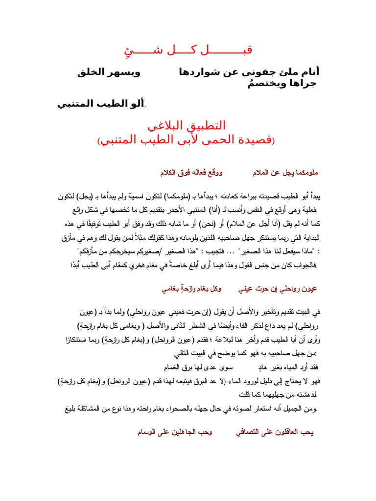 التطبيق البلاغي في قصيدة الحمى للمتنبي